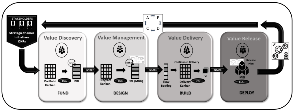 Learning, packaging and deploying MBI’s is the main focus of the value release flow of the value stream, where the release plan is executed, where customer needs are satisfied, where business outcomes are materialised.