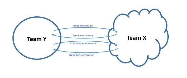 The relationship among teams is a continuous dual loop of needs and outcomes, the basic links bettween the workflows of a value stream.